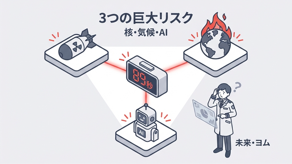 「核」「気候」「AI」。この3つのリスクが複雑に絡み合い、押し出されたのが「89秒」という時刻の正体なんですね。